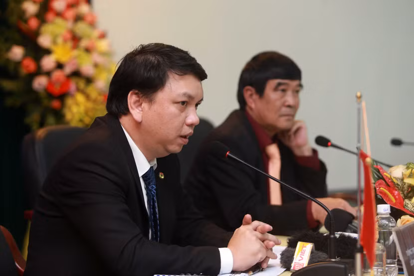 Tổng thư ký VFF Lê Hoài Anh (trái) và Phó Chủ tịch VFF Nguyễn Xuân Gụ tại họp báo