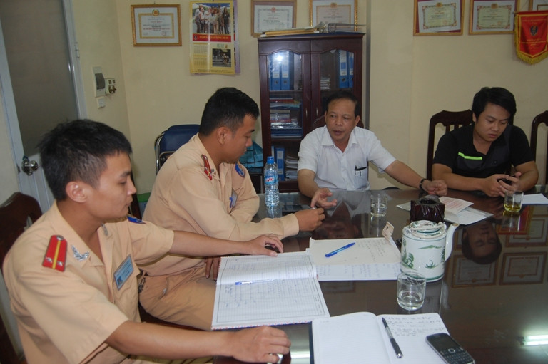 Trung tá Hà Văn Thanh (áo trắng) -Đội phó Đội CSGT số 7 chỉ đạo tổ công tác nhanh chóng hoàn tất hồ sơ trao trả lại xe cho chủ sở hữu tạo điều kiện thuận lợi nhất cho nhân dân
