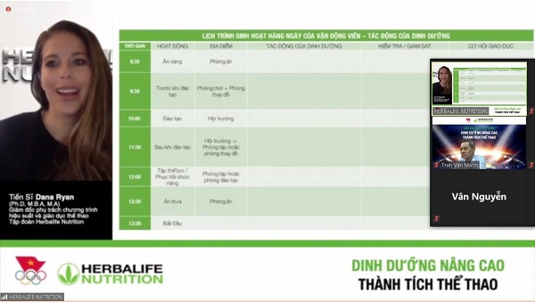 Tại chương trình huấn luyện trực tuyến này, Tiến sĩ Dana Ryan, Giám Đốc phụ trách chương trình Hiệu suất và Giáo dục Thể thao Tập đoàn dinh dưỡng toàn cầu Herbalife Nutrition đã chia sẻ các chiến lược dinh dưỡng, những lời khuyên về cách cung cấp nguồn dinh dưỡng thể thao phù hợp nhất cho cơ thể, và những câu chuyện áp dụng dinh dưỡng tối ưu của các đội thể thao trên khắp thế giới.