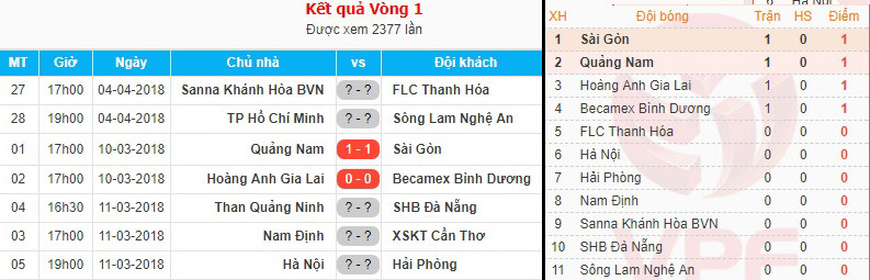 Lịch thi đấu, bảng xếp hạng tạm thời vòng 1 V-League 2018