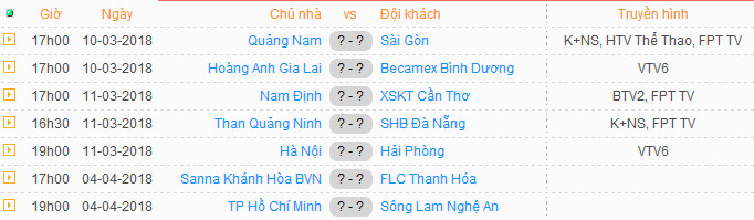 Truyền hình K+ cho biết ở mỗi vòng đấu, sẽ lựa chọn phát sóng từ 1-2 trận trên các kênh thể thao của đài mình, bắt đầu bằng trận khai mạc giải giữa Đương kim vô địch Quảng Nam và CLB Sài Gòn lúc 17h ngày mai (10-3). Sau đó một ngày là trận Than Quảng Ninh - SHB Đà Nẵng lúc 16h30, cũng thuộc vòng 1 V-League 2018.