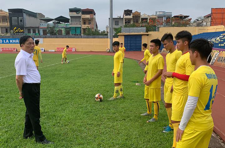 Bầu Đệ tới sân thăm hỏi các thành viên CLB Thanh Hòa trong chiều 25-4, ngay khi nhận quyết định tiếp quản, điều hành đội bóng