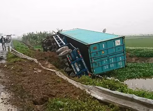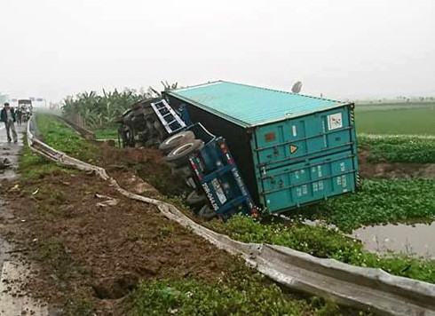 Xe container mang BKS 29C-670xx, biển rơ móc 29R-044xx do anh Nguyễn Danh T. (SN 1983, Việt Yên, Bắc Giang) điều khiển, lưu thông theo hướng Hải Phòng – Hà Nam. Khi đi đến ngã tư Thái Hà thì xảy ra va chạm với xe ô tô 4 chỗ mang BKS 34A-140xx do anh Nguyễn Đắc T. (SN 1978, Đông Hưng, Thái Bình) điều khiển, chạy hướng Ba Đọ - Quỳnh Côi. Hậu quả, xe container bị lật xuống kênh ở ven cao tốc còn xe ô tô 4 chỗ hỏng toàn bộ.
