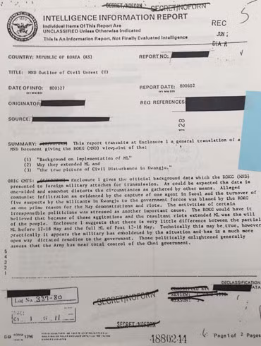 Một trong những tài liệu được công bố hấp dẫn hơn tất cả là báo cáo của CIA về một cuộc họp bí mật do lãnh tụ Triều Tiên Kim Il Sung chủ trì tại Dinh Chủ tịch ở Bình Nhưỡng vào ngày 19-5-1980, ngày thứ hai của cuộc nổi dậy ở Gwangju. Theo CIA, mục đích của cuộc họp là thảo luận về “hành động của Triều Tiên” liên quan đến cuộc nổi dậy. Quân đội nhân dân Triều Tiên có nên can thiệp hay không?