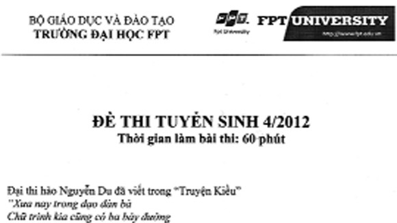 Sáng 8-4, trường đại học FPT đã tổ chức kỳ thi sơ tuyển cho gần 7.500 thí sinh tại 8 điểm thi trên toàn quốc. Chọn vấn đề “Trinh tiết” - chủ đề “nóng” được xuất hiện nhiều trên mặt báo trong thời gian gần đây, đề thi luận của ĐH FPT được đặt ra với suy nghĩ như một diễn đàn cho giới trẻ bày tỏ quan điểm của mình. Bằng việc đưa ra suy nghĩ có phần linh hoạt về “trinh tiết” qua thơ Nguyễn Du, đề thi của ĐH FPT đưa ra đối chiếu, liên tưởng với xu hướng “sống thử” và quan niệm “tình dục trước hôn nhân là điều bình thường” của giới trẻ hiện đại.