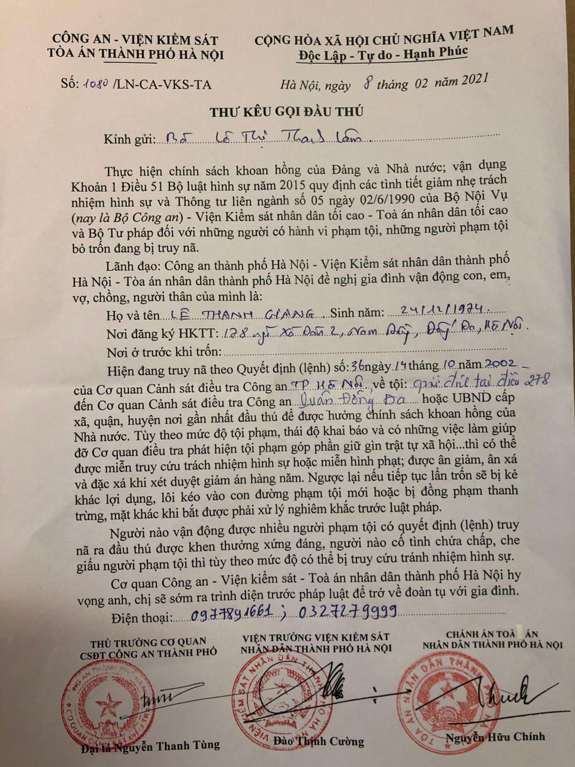 Ngày 8-2, Đội Điều tra tổng hợp Công an quận Đống Đa phối hợp với Công an phường Nam Đồng đã gửi thư kêu gọi đầu thú đối với Lê Thanh Giang (SN 1974, trú tại phường Nam Đồng, quận Đống Đa). Thư kêu gọi đầu thú do liên ngành tư pháp thành phố Hà Nội ký đóng dấu”.