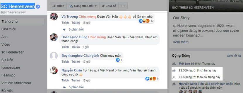 Fanpage của Heerenveen tăng 20.000 người theo dõi chỉ sau một ngày và tràn ngập những bình luận về Văn Hậu đến từ các CĐV Việt Nam