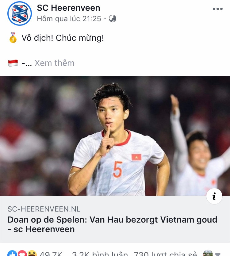 Trong suốt thời gian SEA Games, báo chí Hà Lan dành sự quan tâm và dõi theo hành trình của Đoàn Văn Hậu. Sau trận chung kết tối 10-12, CLB SC Heerenveen đã gửi lời chúc mừng chức vô địch của Văn Hậu cùng U22 Việt Nam bằng tiếng Việt.