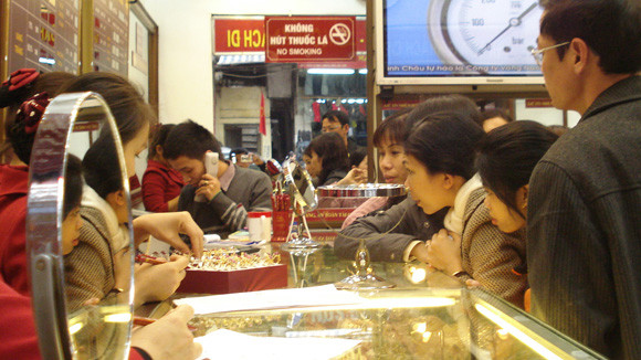Trong nước, ngay từ lúc mở cửa giao dịch, các cửa hàng, đại lý vàng bạc trong nước đã cập nhật và niêm yết với mức tăng 500.000 đồng mỗi lượng. Vàng SJC của Công ty Vàng bạc đá quý Sài Gòn - Hà Nội (SJC) có mức giá mua vào là 46,1 triệu đồng/lượng và bán ra 46,35 triệu đồng/lượng. Vàng Rồng Thăng Long của Công ty Bảo Tín Minh Châu được niêm yết ở mức 45,9 triệu đồng/lượng (mua vào) và 46,2 triệu đồng/lượng (bán ra). Đến buổi chiều, giá vàng tiếp tục tăng thêm 200.000 đồng mỗi lượng. So với giá vàng thế giới, giá vàng trong nước chênh lệch không đáng kể. Tính theo quy đổi, giá vàng thế giới hiện đang ở mức 45,3 triệu đồng/lượng chưa kể các khoản thuế và phí.