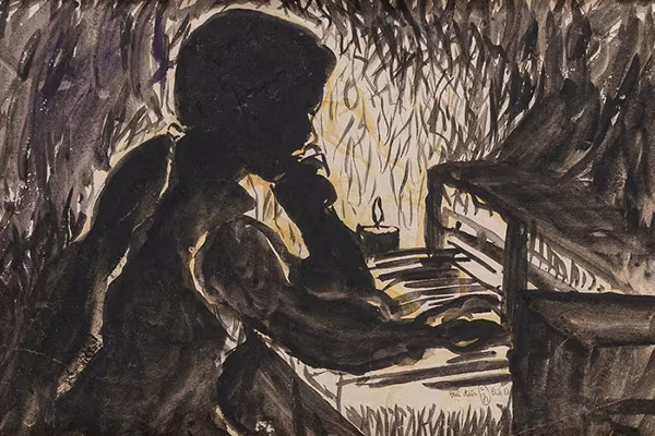 Trực đêm, 1971 - Màu nước trên giấy, 38 x 25 cm - Họa sĩ Nguyễn Đức Dụ