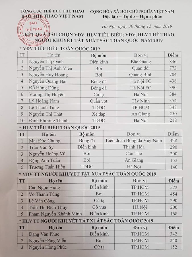 Theo kết quả cuộc bầu chọn VĐV tiêu biểu toàn quốc vừa được công bố, với 846 điểm, VĐV điền kinh Nguyễn Thị Oanh đã vượt qua Ánh Viên (hạng nhì, 772 điểm) hay Huy Hoàng (hạng ba, 704 điểm) để cán đích ở vị trí số 1.