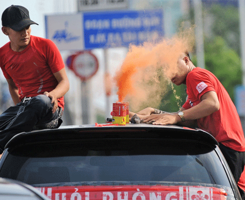 Trước khi tạo “vết nhơ” trên sân Mỹ Đình tối 24-6, CĐV Hải Phòng còn gây náo loạn đường phố Hà Nội với khói, lửa phát ra từ hàng chục quả pháo sáng đốt trên những chiếc xe khách đang di chuyển. Rất nhiều CĐV cởi trần, thò nửa người ra ngoài cửa kính ô tô, tay cầm pháo sáng và miệng hò hét tạo hình ảnh phản cảm. Để đảm bảo an toàn cho người tham gia giao thông và cho chính CĐV Hải Phòng trên gần 100 xe ô tô, CSGT Hà Nội đã tách đoàn làm 2 hướng, điều phối đưa về tới sân Mỹ Đình an toàn.