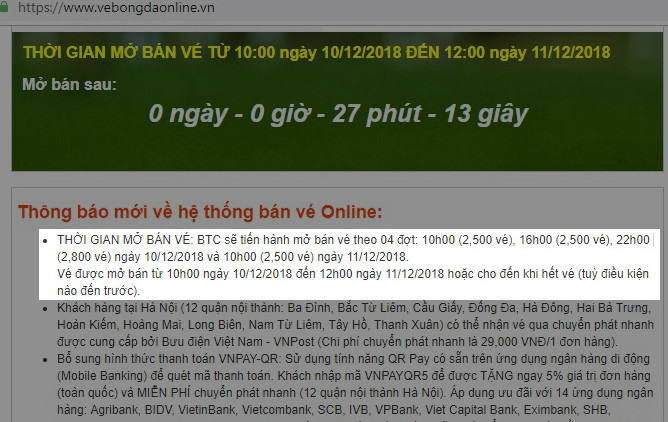 10h sáng nay 10-12-2018, Liên đoàn bóng đá Việt Nam (VFF) cùng đối tác công nghệ mở bán vé trận chung kết lượt về AFF Cup 2018 giữa đội tuyển Việt Nam và đội tuyển Malaysia vào 19h30 ngày 15-12 tới.