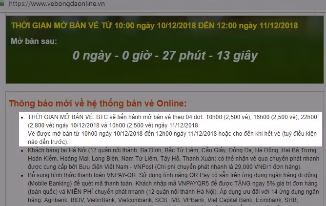 Cùng với đó, VFF cũng cảnh báo người hâm mộ về việc xuất hiện trang web vebongonline.com.vn giả mạo trang web bán chính thức có địa chỉ vebongdaonline.com.vn. Người hâm mộ cần rất lưu ý, không truy cập, cung cấp thông tin cá nhân hay chuyển tiền mua vé trên trang web giả mạo nói trên.