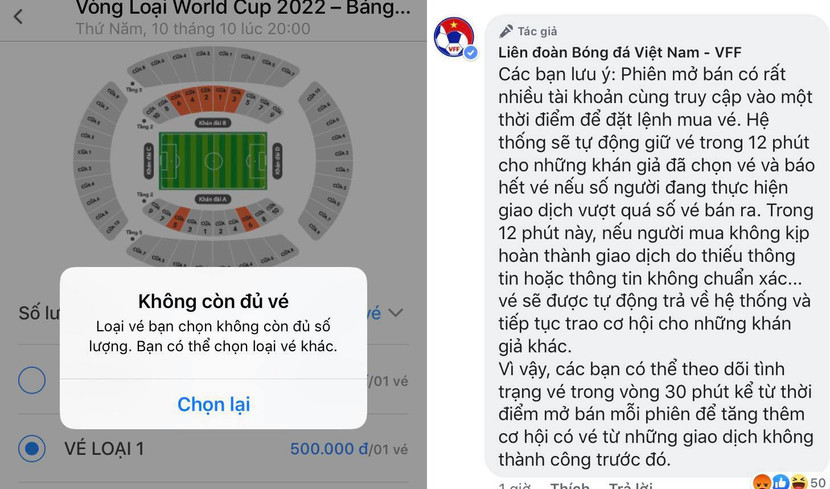Lý giải điều này, VFF cho biết: "Mỗi phiên mở bán có rất nhiều tài khoản cùng truy cập vào một thời điểm để đặt lệnh mua vé. Hệ thống sẽ tự động giữ vé trong 12 phút cho những khán giả đã chọn vé và báo hết vé nếu số người đang thực hiện giao dịch vượt quá số vé bán ra.