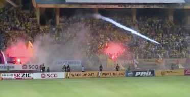 CĐV Nam Định ném hàng chục quả pháo sáng xuống sân, gây nguy hiểm cho cầu thủ hai đội và khiến trận đấu bị gián đoạn 6 phút