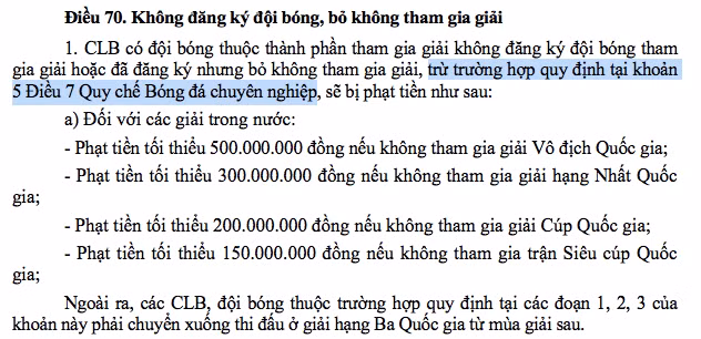 Theo tìm hiểu, đúng là Điều 70 Quy định về kỷ luật của VFF có quy định mức phạt như trên với CLB tự ý bỏ giải. Thế nhưng, Điều 70 cũng nhấn mạnh việc không áp dụng với trường hợp quy định tại khoản 5 Điều 7 Quy chế bóng đá chuyên nghiệp, đó là: "CLB không đáp ứng đủ các điều kiện quy định tại khoản 4 Điều này sẽ bị chuyển xuống thi đấu ở hạng có các điều kiện phù hợp và bị thay thế bằng CLB đáp ứng đầy đủ các điều kiện có thứ hạng cao ở hạng dưới liền kề hạng có CLB không đáp ứng đủ các điều kiện".