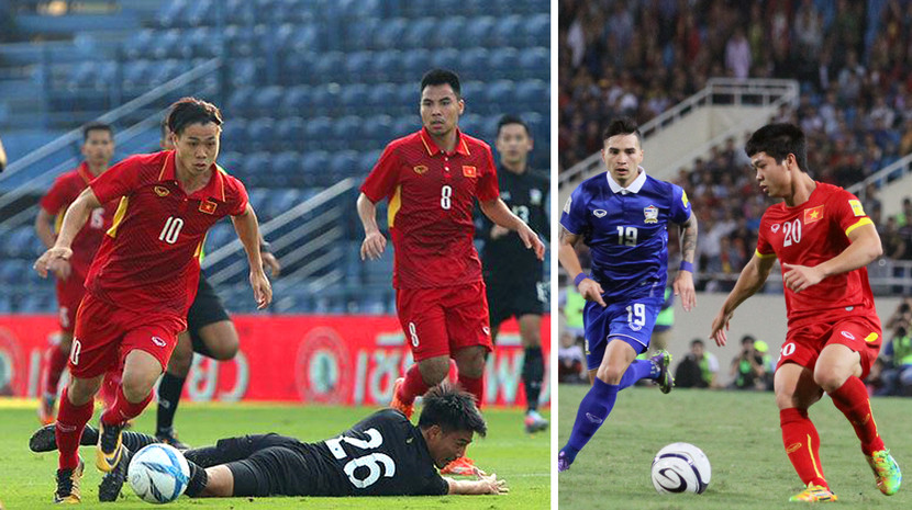 Công Phượng trong trận ĐT Việt Nam thua Thái Lan 0-3 tại Mỹ Đình năm 2015, thời HLV Miura (ảnh trái) và Công Phượng lập cú đúp trong trận thắng U23 Thái Lan 2-1 tại Bangkok năm 2017, thời HLV Park Hang-seo