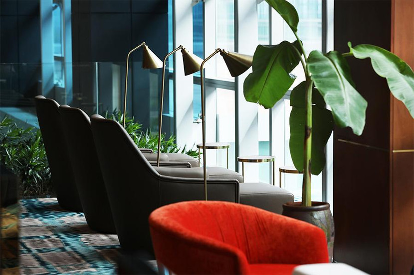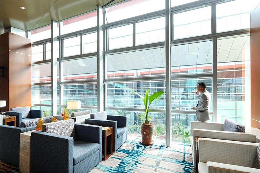 Đó chính là hệ thống cửa sổ kính lớn được thiết kế tràn từ trần xuống tận sàn phòng chờ, vừa giúp đón ánh sáng tự nhiên, tiết kiệm năng lượng cho sân bay, vừa mang tới tầm nhìn thoáng rộng cho các khách VIP, hướng thẳng ra không gian tràn ngập cây xanh ngay vườn treo kế bên.