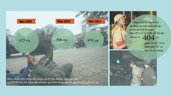Trên đây là một trong số hàng chục vụ cướp giật tài sản được Đội 8 truy xét, làm rõ thủ phạm. Theo Trung tá Nguyễn Thành Tín, Đội trưởng Đội 8, từ khi thực hiện Kế hoạch 141 của Giám đốc CATP Hà Nội (tháng 6-2011), do áp dụng các biện pháp trấn áp mạnh tội phạm, nên năm 2012 số vụ cướp giật tài sản chỉ xảy ra 404 vụ, giảm 35 vụ (7,9%) so với năm 2011. Với vai trò chủ công trấn áp tội phạm, lực lượng CSHS - CATP Hà Nội phối hợp với các đơn vị có liên quan thực hiện kế hoạch 141 đã nắm chắc thông tin về tình hình hoạt động của tội phạm cướp giật tài sản trên các tuyến, địa bàn trọng điểm; Nắm vững những số liệu thống kê, so sánh để nhìn ra những địa bàn “nóng” về hoạt động của tội phạm cướp giật tài sản, từ đó dựng đặc điểm của đối tượng nghi vấn, thông qua sự mô tả của người bị hại và các nhân chứng; đồng thời xác định được loại phương tiện chúng thường sử dụng gây án, rồi lập kế hoạch phối hợp đấu tranh bằng các chuyên án kết hợp với tuần tra mật phục trên các tuyến, địa bàn đã được định sẵn.