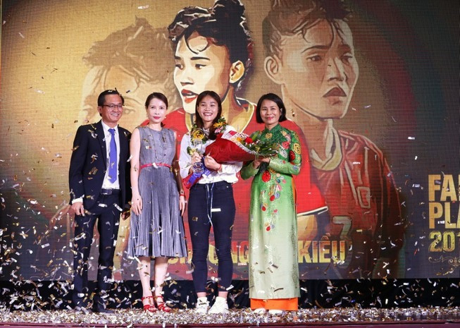 Trung vệ Chương Thị Kiều (thứ hai từ phải qua) nhận giải Fair Play 2019