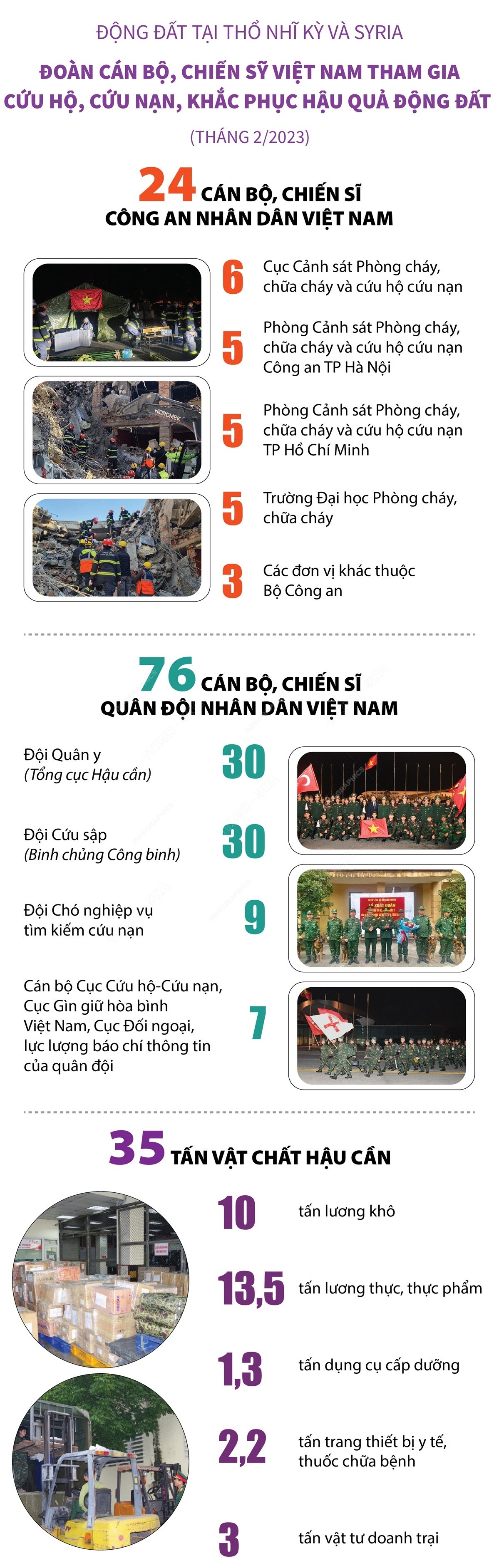 Khi lực lượng tham gia hỗ trợ nhân đạo, cứu trợ thảm họa của Quân đội nhân dân Việt Nam bắt tay vào thực hiện nhiệm vụ tại Thổ Nhĩ Kỳ, Đoàn cứu hộ, cứu nạn của Công an Nhân dân Việt Nam đã không quản ngại điều kiện thời tiết khắc nghiệt tiến hành tìm kiếm nạn nhân động đất ngay lúc đặt chân tới nơi cách đó 2 ngày (ngày 11-2-2023). Với trang thiết bị chuyên dụng hiện đại như camera dò tìm, phát hiện bằng hình ảnh, âm thanh để phát hiện sự sống Đội cứu hộ, cứu nạn của Công an nhân dân đã cùng với Đội cứu hộ của Pakistan tìm thấy và cứu sống một thiếu niên 14 tuổi nằm sâu dưới đống đổ nát.