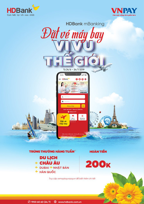 Theo đó, từ ngày 24/06/2019 đến 24/07/2019, HDBank triển khai chương trình “Đặt vé máy bay – Vi vu thế giới” hoàn ngay tiền mặt, tặng các chuyến du lịch quốc tế hấp dẫn và nhiều voucher vé máy bay giá trị.