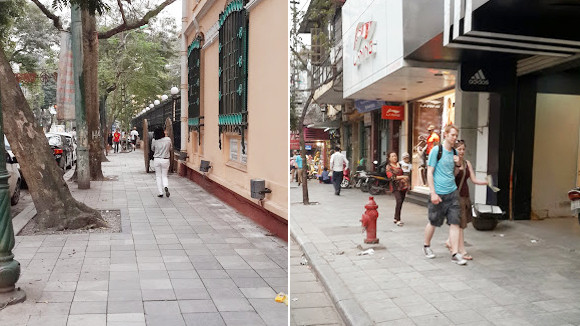 Có đi qua những đoạn vỉa hè đông đúc, dày đặc xe máy, bàn ghế và hàng rong, mới thấy trân trọng sự yên tĩnh, thanh bình của những đoạn vỉa hè rộng rãi, sạch sẽ. Dạo một vòng qua tuyến phố Tràng Tiền - Lê Thái Tổ - Tràng Thi, chúng tôi cảm nhận rõ hơn về điều này. Mặc dù ở các tuyến phố này vẫn có trung tâm thương mại, các cửa hàng kinh doanh túi xách, quần áo, giày dép…song không có bóng dáng xe máy, xe đạp của khách dừng đỗ trên vỉa hè. Các phương tiện này đều được trông giữ trong nhà hoặc trong các ngõ nhỏ do các chủ cửa hàng liên hệ cho khách. Bên cạnh đó, hàng rong, hàng nước, hàng ăn… cũng hầu như không có.