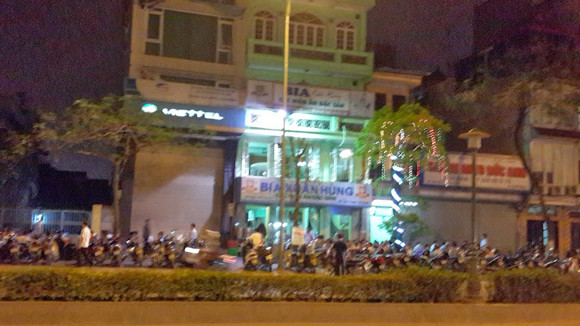 Vòng qua phố Nguyễn Văn Cừ, đoạn giao cắt ngã tư Nguyễn Sơn- Nguyễn Văn Cừ, chúng tôi chứng kiến cảnh tượng tương tự. Tại đây, một quán bia hơi khá nổi tiếng đã chiếm dụng khoảng vỉa hè dài hơn chục mét để kê bàn ghế cho khách ngồi ăn, nhậu. Suốt dọc chiều dài của tuyến phố, ngay sát lòng đường, hàng dãy xe máy xếp hàng dài được chủ quán tận dụng làm bãi gửi xe cho thực khách giữa hàng trăm phương tiện qua lại đông đúc trên tuyến đường.