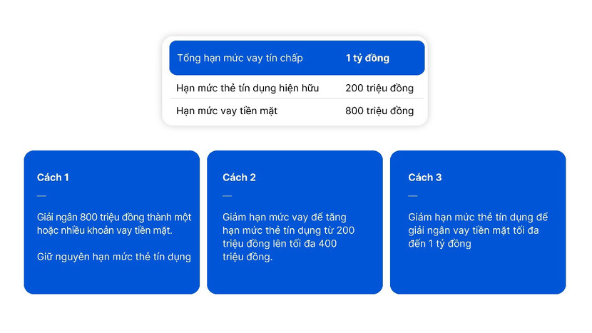 Với Super Cash, người dùng sẽ được cấp một hạn mức tín dụng tối đa tới 1 tỷ đồng bao gồm thẻ tín dụng và khoản vay tiền mặt. Tùy theo nhu cầu sử dụng, người dùng có thể luân chuyển hạn mức từ thẻ sang tiền mặt hoặc ngược lại khi cần vốn nhanh mà không cần mở khoản vay mới.