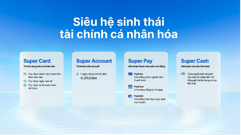 Trong đó có thể kể đến, Super Card - Thẻ tín dụng siêu cá nhân hoá cho phép khách hàng chủ động thiết lập danh mục hoàn tiền, ngày sao kê, hạn thanh toán tuỳ theo nhu cầu và tính chất dòng tiền; hay Super Account - Tài khoản Siêu Lợi Suất sinh lời đến 4,3%/năm trên dòng tiền chi tiêu linh hoạt.