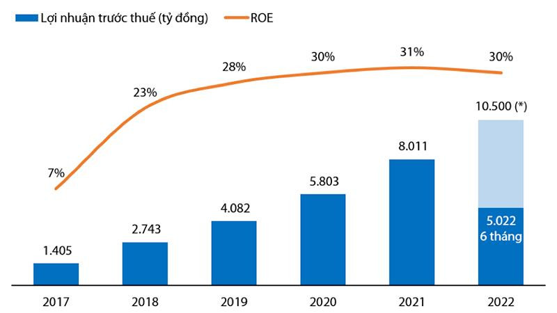 Lợi nhuận trước thuế và ROE của VIB giai đoạn 2017 – 2022