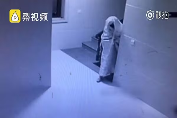 Video giám sát từ bên trong tòa chung cư ở Tần Giang, tỉnh Phúc Kiến cho thấy tên trộm lén nhìn quanh các góc nhà sau khi leo lên cầu thang, và phát hiện ra rằng một camera an ninh đang theo dõi hắn từ hành lang.