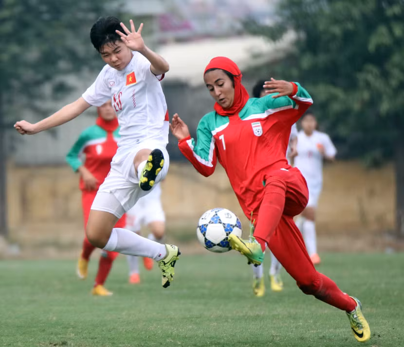 U19 nữ Việt Nam (áo trắng) và U19 nữ Iran cạnh tranh quyết liệt (ảnh VFF)
