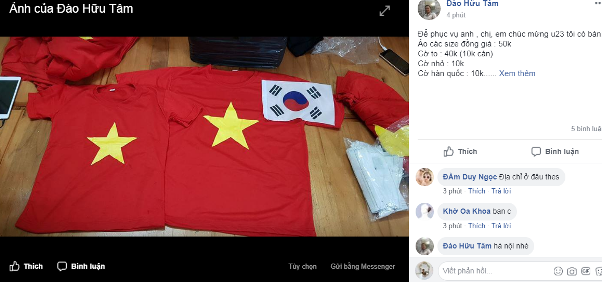 Tranh thủ dịp này, một số người bán hàng trên Facebook cũng rao bán áo để cổ vũ đội tuyển Việt Nam. Giá phổ biến là 50.000 đồng/chiếc áo, lá cờ Việt Nam to 40.000 đồng/chiếc, cờ nhỏ 10.000 đồng/chiếc. Cờ nhỏ Hàn Quốc và băng rôn cũng đồng giá 10.000 đồng/chiếc. Khách hàng mua từ 5 áo sẽ được miễn phí vận chuyển.