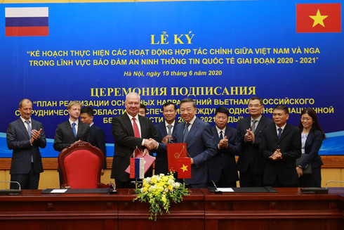Đại tướng Tô Lâm, Ủy viên Bộ Chính trị, Bộ trưởng Bộ Công an và Đại sứ Konstantin Vasilievich Vnukov ký, trao “Kế hoạch thực hiện các hoạt động hợp tác chính giữa Cộng hòa xã hội chủ nghĩa Việt Nam và Liên bang Nga trong lĩnh vực bảo đảm an ninh thông tin quốc tế giai đoạn 2020 - 2021”