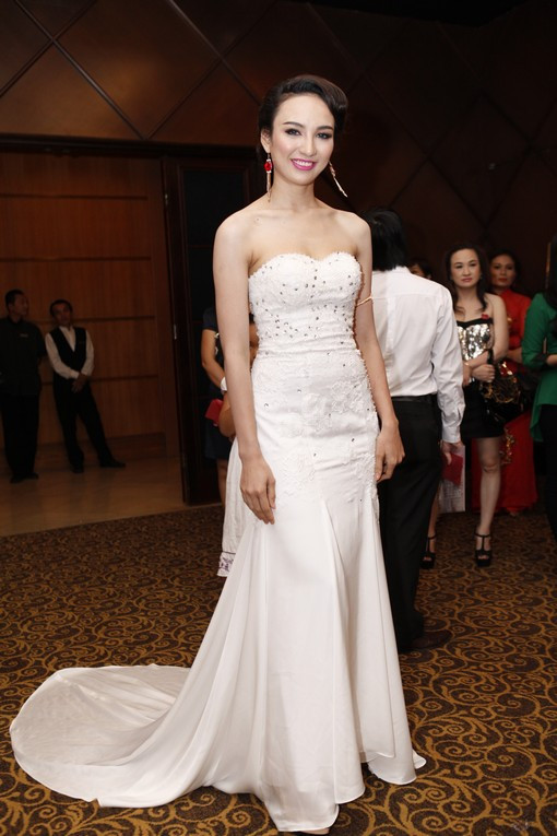 Trang Nhung khoe làn da trắng mịn nổi bật trong chiếc đầm dài thướt tha