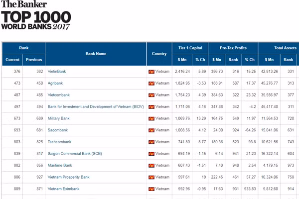 Các ngân hàng Việt Nam trong Top 1000 World Banks 2017 của The Banker (nguồn: www.thebankerdatabase.com)