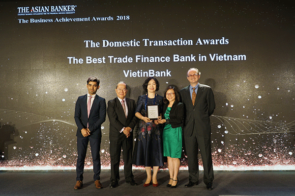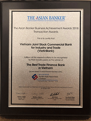 Về hoạt động thanh toán quốc tế và tài trợ thương mại, đây là năm thứ hai liên tiếp VietinBank được The Asian Banker vinh danh là Ngân hàng Tài trợ thương mại tốt nhất Việt Nam. Điều này một lần nữa khẳng định lựa chọn đúng đắn của khách hàng khi đồng hành cùng VietinBank. Kết quả trên là do VietinBank liên tục cải tiến sản phẩm, nâng cao chất lượng dịch vụ, tăng cường hiệu quả hoạt động, không ngừng đem đến cho khách hàng những trải nghiệm ấn tượng với dịch vụ tiêu chuẩn quốc tế.