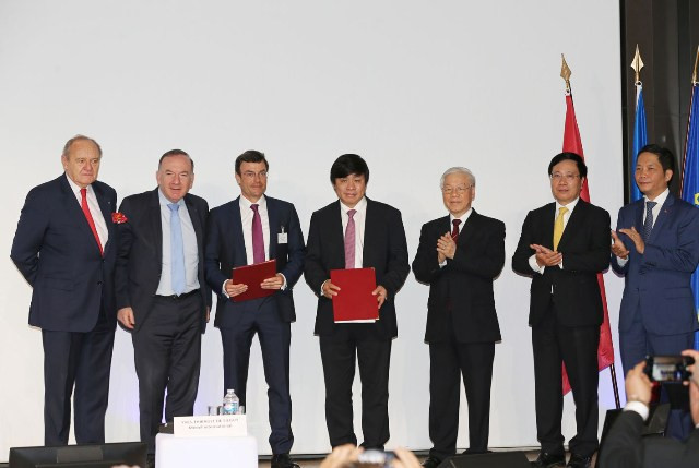 Vietjet Air và đối tác trao chứng nhận ký kết dưới sự chứng kiến của Tổng Bí thư Nguyễn Phú Trọng và lãnh đạo cấp cao của Pháp