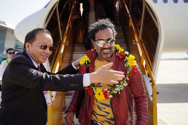 Lãnh đạo Vietjet Air tặng hoa cho những hành khách đầu tiên trên một loạt chuyến bay mới khai trương của hãng từ sân bay Đà Nẵng