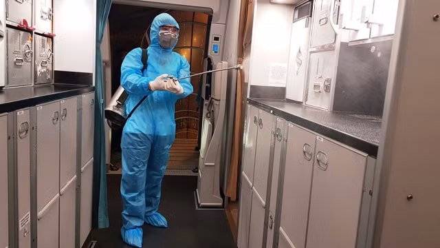 Theo đó, Vietnam Airlines đã chủ động trang bị dụng cụ, hóa chất, triển khai đào tạo và xây dựng quy trình khử trùng gồm hai bước cơ bản là phun khử trùng tàu bay và lau chùi vệ sinh trang thiết bị bằng dung dịch chuyên dụng.