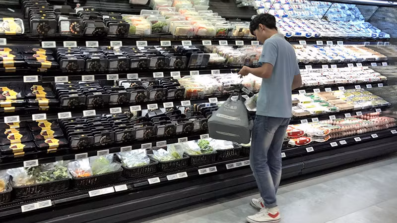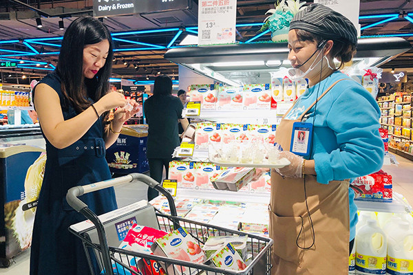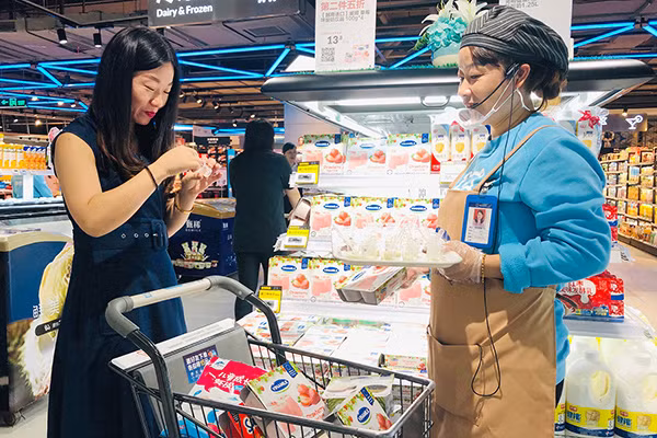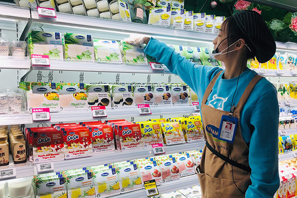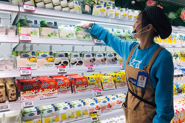 Nhân viên của siêu thị Hema Hồ Nam tại quầy sản phẩm sữa chua của Vinamilk