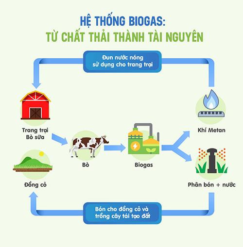 Cụ thể hóa định hướng này, Vinamilk đã ứng dụng mô hình kinh tế tuần hoàn vào hệ thống trang trại và nhà máy từ nhiều năm qua. Bước đầu các sáng kiến này đã mang lại các hiệu quả tích cực. Đơn cử như tại các trang trại bò sữa, vòng tuần hoàn nông nghiệp xanh của Vinamilk với trọng tâm là công nghệ Biogas và nguyên lý biến chất thải thành tài nguyên. Đây là điểm sáng đáng ghi nhận trong nỗ lực triển khai kinh tế tuần hoàn tại Vinamilk, mang đến lợi ích đáng kể về môi trường, tận dụng năng lượng tái tạo và giảm thiểu đáng kể lượng CO2 phát thải.