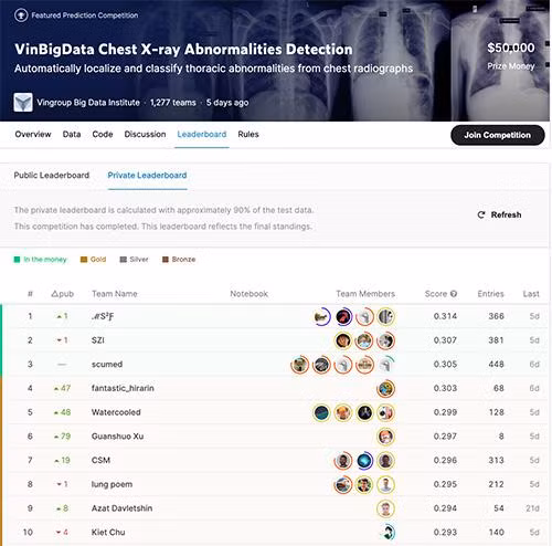 Cuộc thi “Ứng dụng AI phát hiện điểm bất thường trên ảnh X-quang lồng ngực” do Viện nghiên cứu dữ liệu lớn VinBigdata tổ chức, được triển khai toàn cầu trên Kaggle (sân chơi uy tín dành cho cộng đồng khoa học dữ liệu) từ 31/12/2020 đến ngày 31/3/2021.