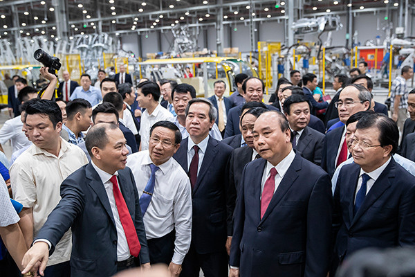 Thủ tưởng Nguyễn Xuân Phúc và các vị khách quý cùng Chủ tịch Tập đoàn Vingroup Phạm Nhật Vượng tham quan Nhà máy sản xuất ô tô VinFast