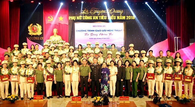 Đại tướng Tô Lâm, Ủy viên Bộ Chính trị, Bộ trưởng Bộ Công an; Thượng tướng Nguyễn Văn Thành, Ủy viên Trung ương Đảng, Thứ trưởng Bộ Công an; bà Hoàng Thị Ái Nhiên, Phó Chủ tịch Thường trực Trung ương Hội Liên hiệp phụ nữ Việt Nam dự và chúc mừng 46 cá nhân tiêu biểu trong phong trào phụ nữ Công an nhân dân năm 2018.