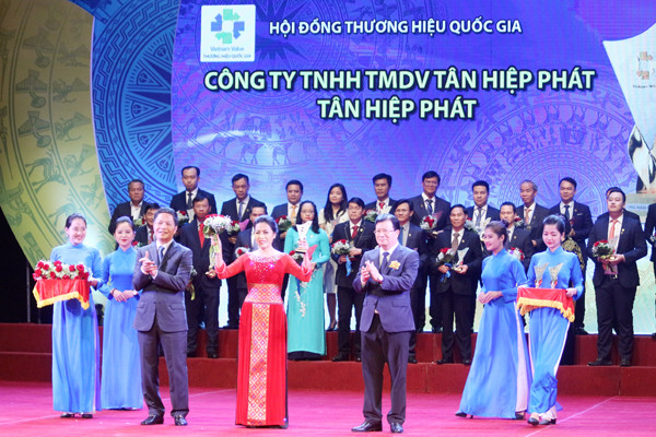 Phó Thủ tướng Trịnh Đình Dũng, Bộ trưởng Bộ Công Thương Trần Tuấn Anh trao biểu trưng cho Công ty TNHH TMDV Tân Hiệp Phát - một trong các doanh nghiệp có sản phẩm đạt Thương hiệu quốc gia 2018