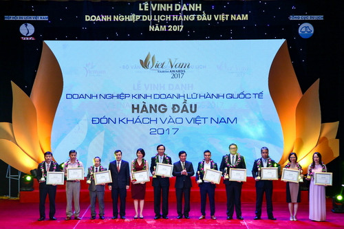 Phó Trưởng ban Kinh tế Trung ương Ngô Đông Hải và Thứ trưởng Bộ Văn hóa Thể Thao và Du lịch Huỳnh Vĩnh Ái trao giải thưởng cho 10 công ty lữ hành quốc tế hàng đầu đón khách du lịch vào Việt Nam năm 2017