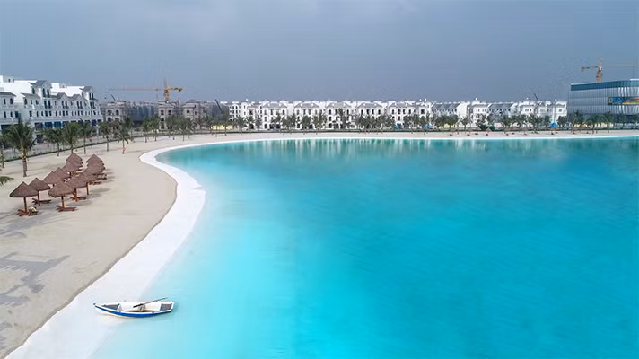 Biển hồ nước mặn Vinhomes Ocean Park được ví như một viên ngọc quý giá giữa lòng thành phố với sắc xanh lam ngọc đặc trưng.